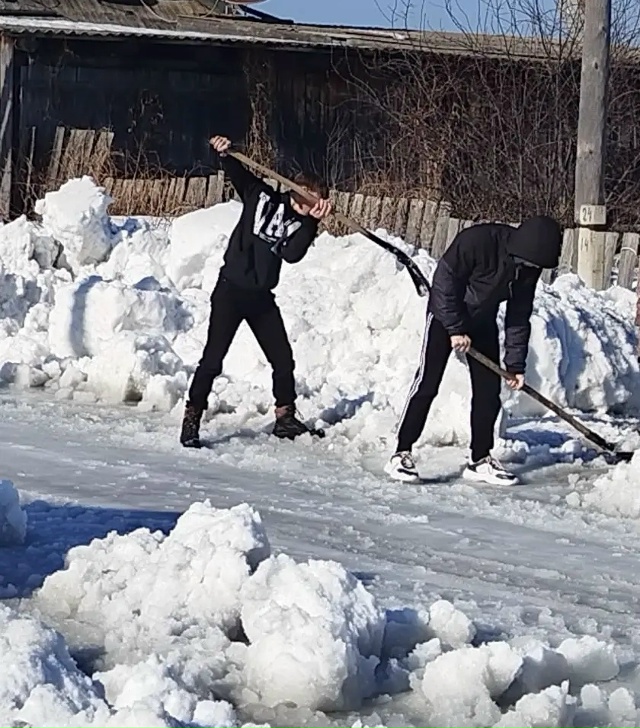 На этих выходных наши мальчишки, поспешили на помощь бабушке – соседке, которая пыталась сама убрать огромные снежные глыбы возле дома.