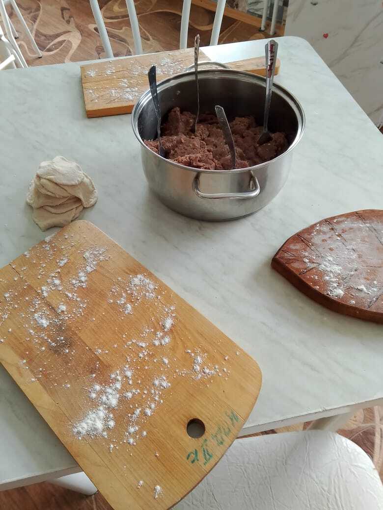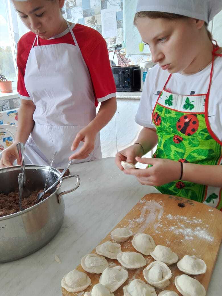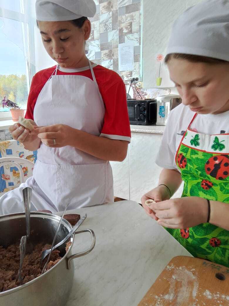 Здесь, под чутким руководством Елены Павловны, проходит мастер-класс по приготовлению пельменей.