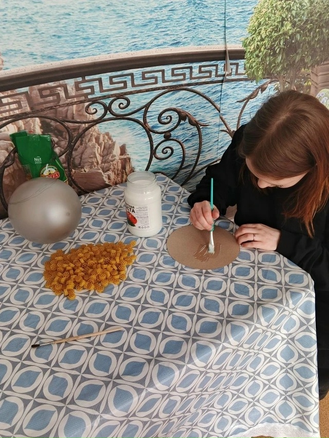 Для изготовления поделки понадобились: макаронные изделия в форме цветка, клей ПВА, цветная бумага, бусы, на изготовление которого ушло три дня.